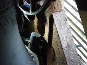 Die neue Kirche erhielt einen Dachreiter mit Glockenstuhl für zwei Glocken, gestimmt auf G und H. Sie übernehmen bis heute das zivile und kirchliche Geläut und den Zeitschlag in unserem Dorf. Der Glockenstuhl aus Eichenholz ist solide, auch nach 174 Jahre Dienst.